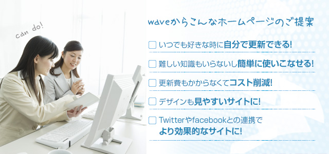 業者さんに完全委託しているので、すぐに更新できない…。更新に費用がかかる…。今のホームページが古くなってきた…。などなど、WEBサイトの運営にお悩みの方はたくさんいらっしゃいます。waveでは、みなさまにとってメリットの多い、CMS型のホームページをご提案いたします。